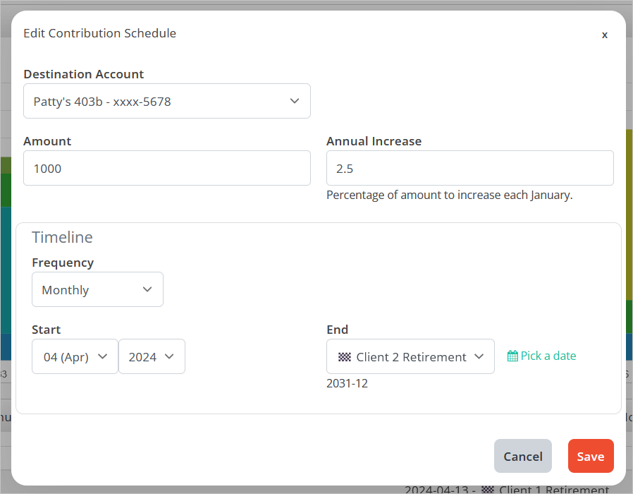 End can be set to specific month/year or an event such as the client’s retirement. Using events ensures that even if you change the date on which the event occurs, all items using that event as a start or end date will update accordingly as well.