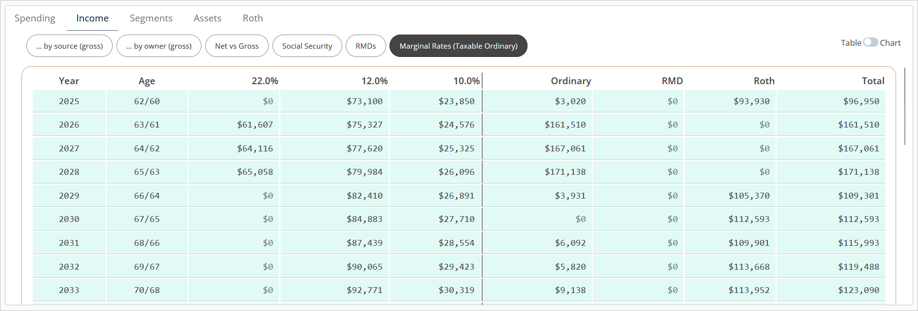 Income is a collection of views that focus on projected income sources based on account withdrawals, other income, and RMDs. Each view has a chart and table view that can be switched between using the toggle in the upper right hand corner of the view panel.