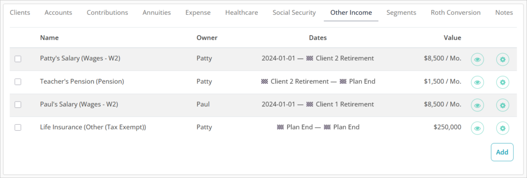 Clicking the 👁️ icon in a row will toggle whether the income source is included or excluded from the plan scenario.